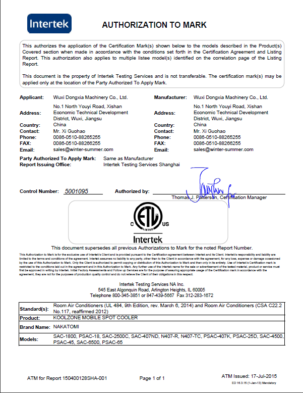 其实早在2012年爱体育在线登录-爱体育(中国)就已经取得3个机型的ETL认证证书,通过这次的证书的增补,现在爱体育在线登录-爱体育(中国)全系列的冷气机都已取得ETL认证,为公司今后加大美国市场的开拓步伐又增加了新的动力。目前爱体育在线登录-爱体育(中国)除了美国ETL认证,还取得了欧盟CE、日本PSE、中国CCC认证,这证明了无论从实用性还是安全性等各方面考虑,爱体育在线登录-爱体育(中国)的移动式工业冷气机都符合国内、国际多个标准,是值得消费者信任和选择的好产品。取得上述认证,是爱体育在线登录-爱体育(中国)实施海外市场产品战略迈出的又一重要步伐,此证也预示着爱体育在线登录-爱体育(中国)开拓海外市场的步伐日益加紧。
